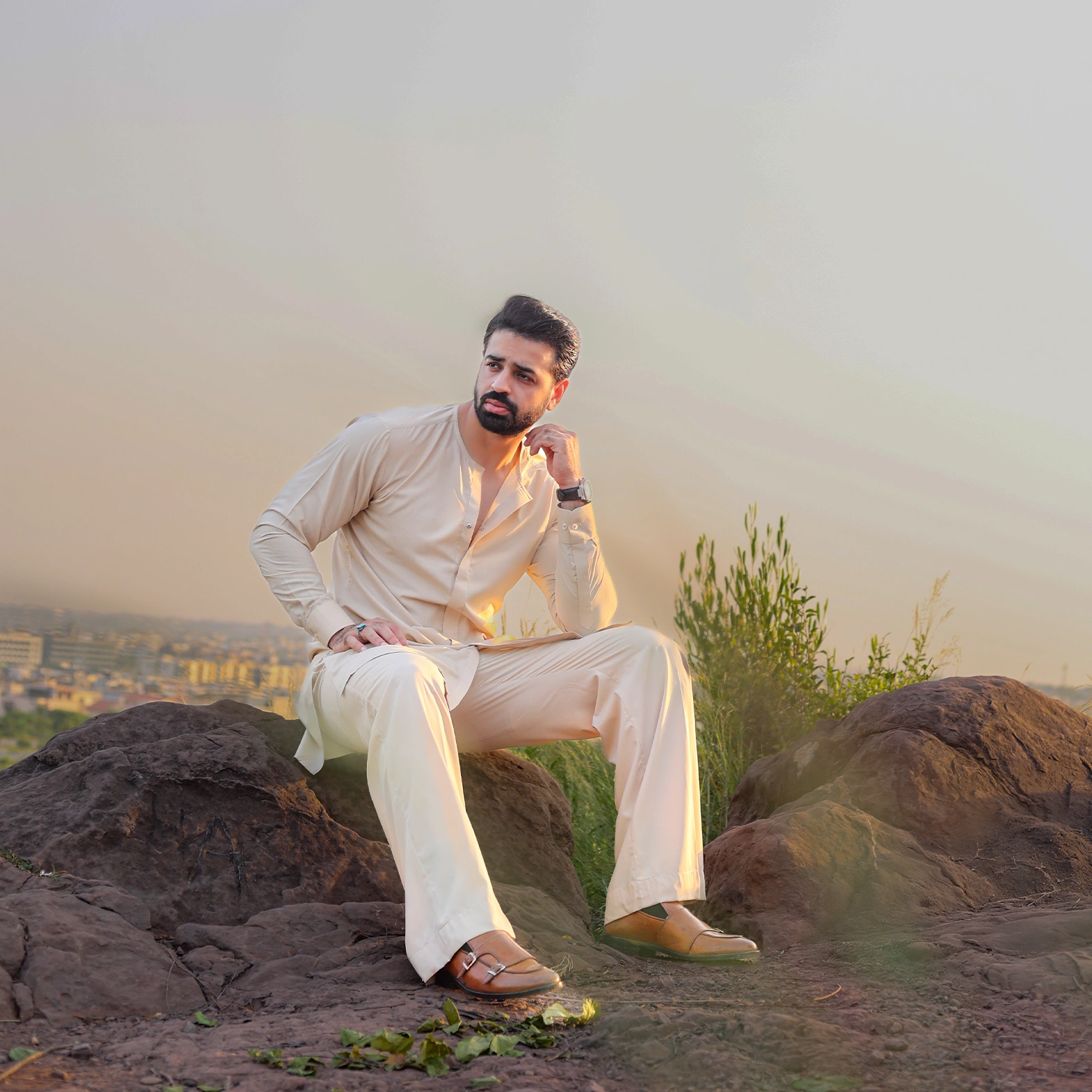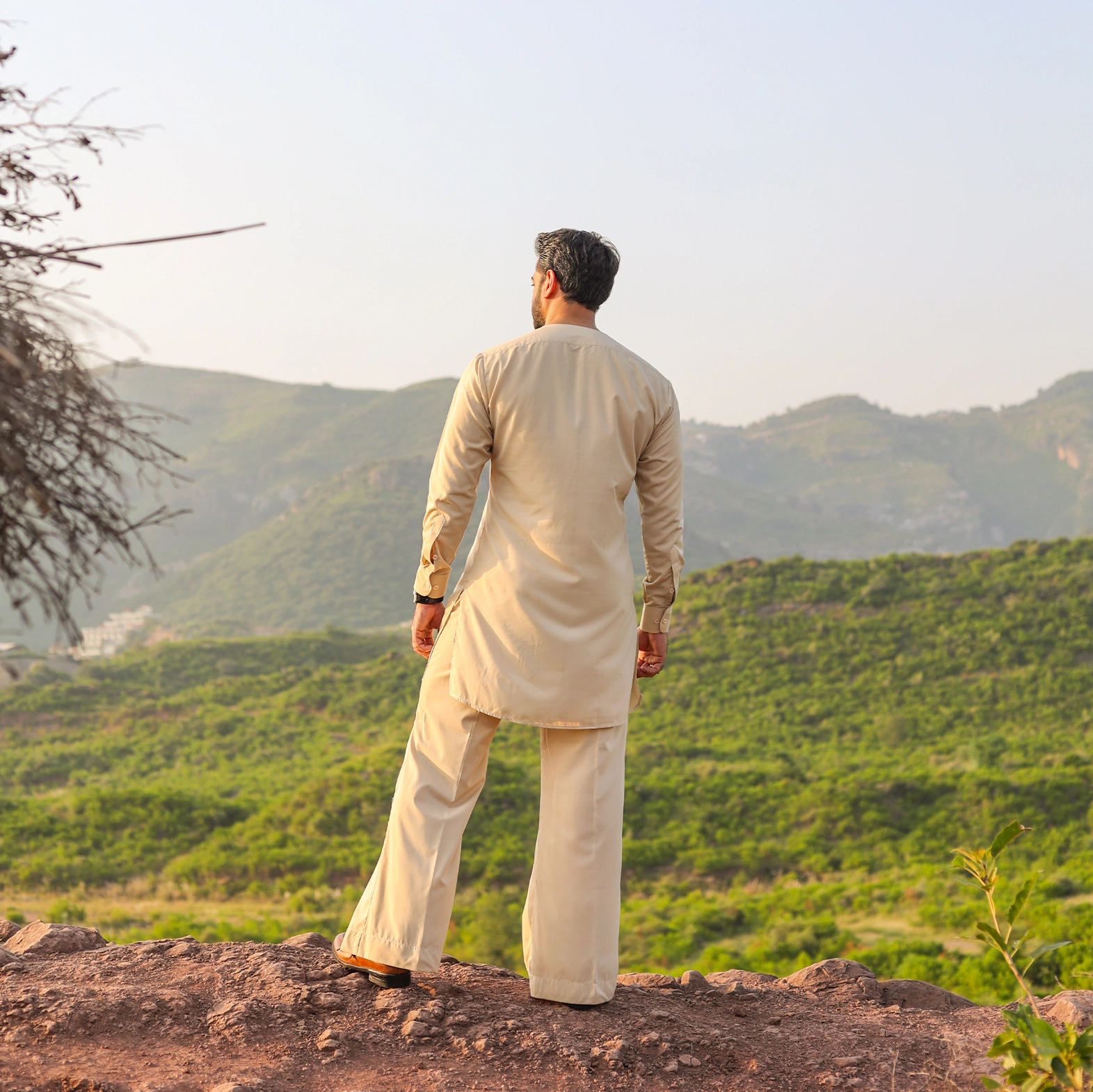 This cream beige shirt-style kurta for men is a must-have if you’re looking for stylish Pakistani kurtas online that are both trendy and traditional
