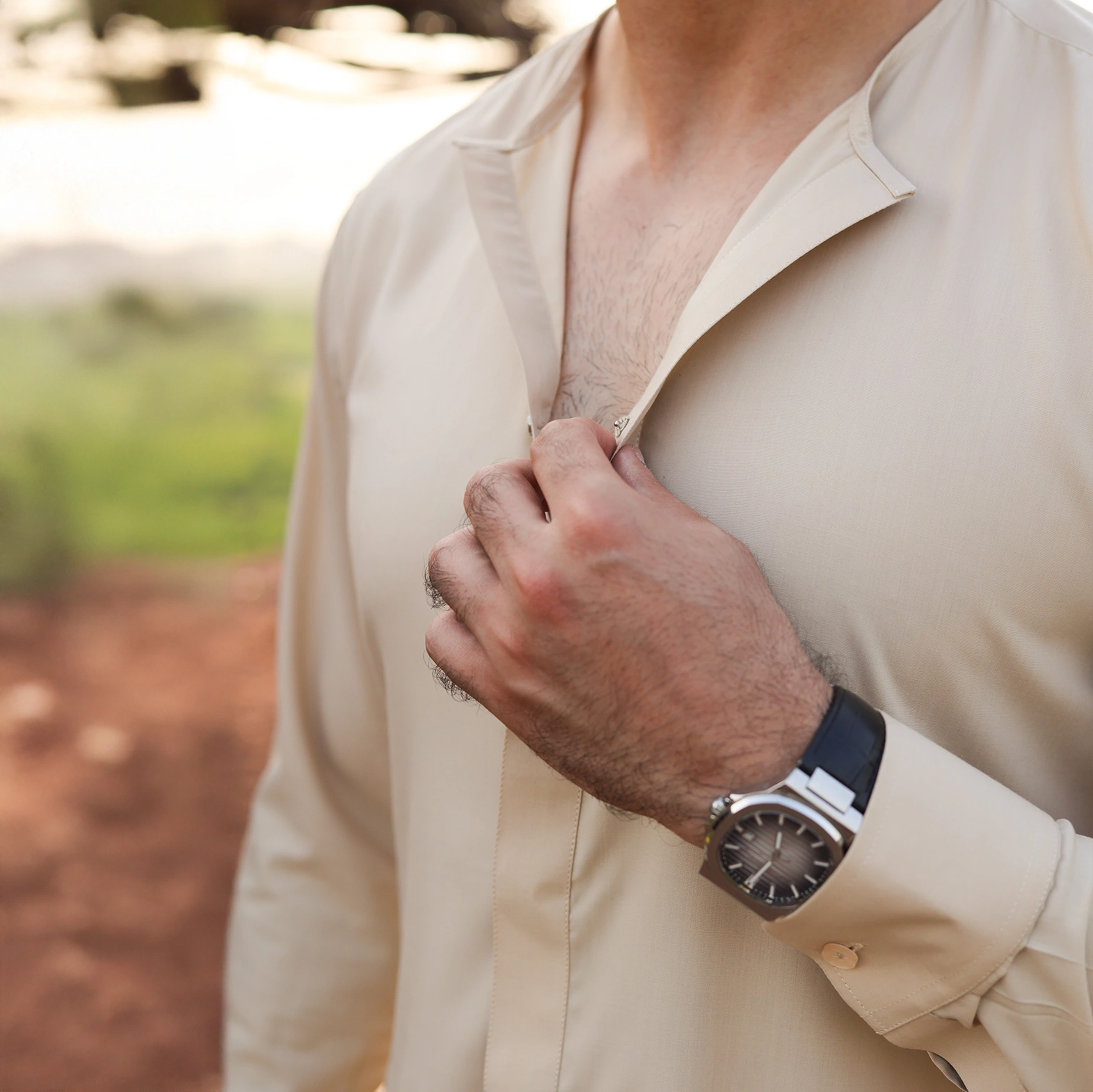 Men’s Shirt-Style Kurta in Cream Beige – Modern & Elegant