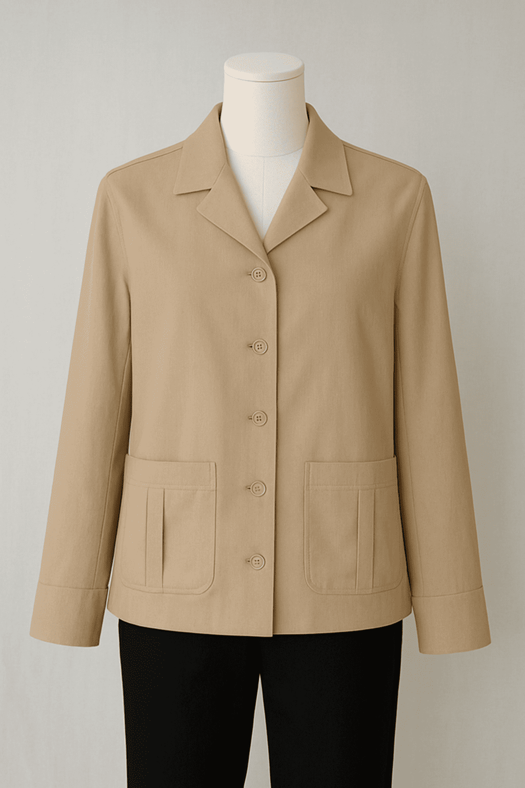 Details include a structured collar, button-down front, and spacious pockets that blend function with understated style. The soft yet sturdy material drapes naturally, making it ideal for layering over tees or turtlenecks in cooler weather.